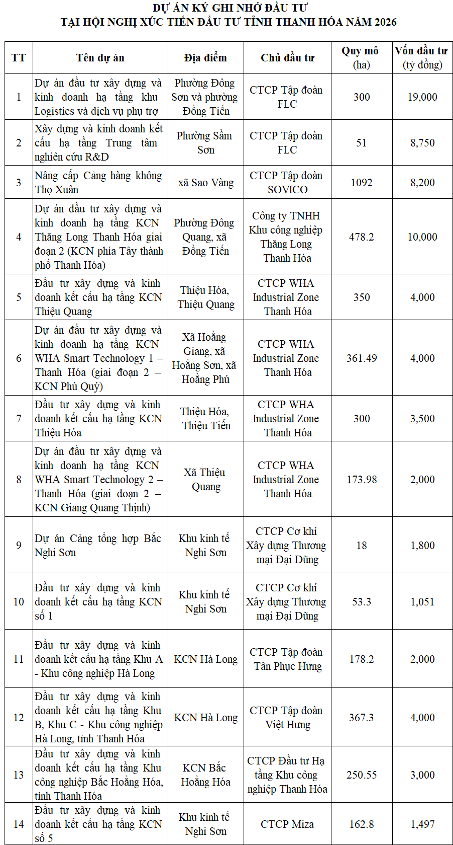 Tại hội nghị xúc tiến đầu tư năm 2026, Thanh Hóa ký kết biên bản ghi nhớ hợp tác đầu tư 14 dự án, với tổng vốn gần 73 ngàn tỷ đồng, với phần lớn là các dự án khu công nghiệp vốn hơn 35 ngàn tỷ đồng, trên diện tích gần 2,676ha.