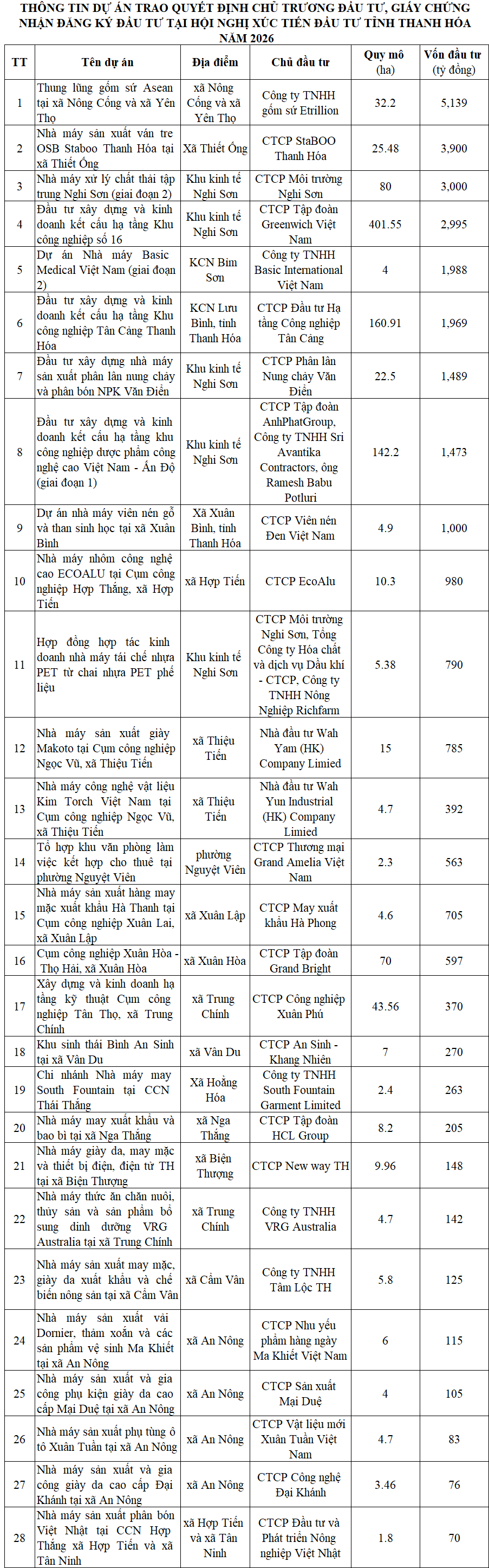 UBND tỉnh Thanh Hóa cũng đã trao quyết định chủ trương đầu tư, Giấy chứng nhận đăng ký đầu tư cho 28 dự án, với tổng số vốn đầu tư gần 30,000 tỷ đồng.