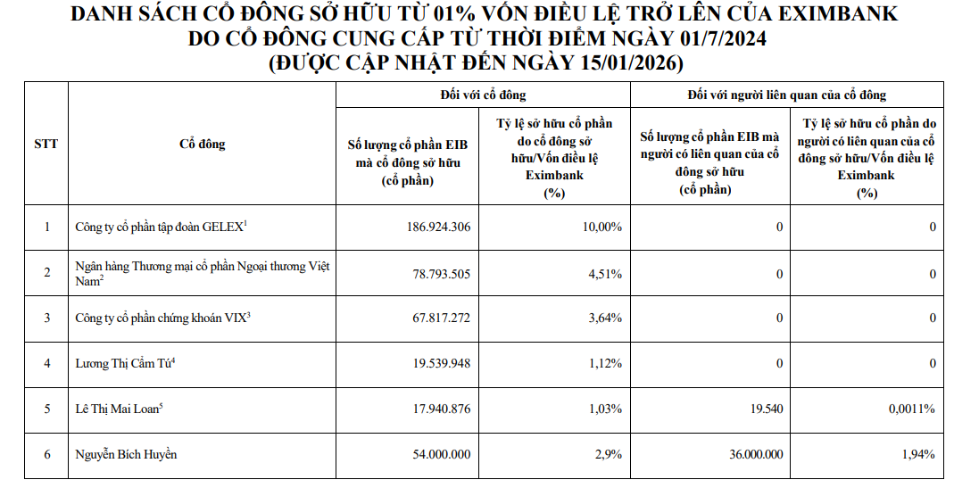 Ở diễn biến khác, danh sách cổ đông sở hữu từ 1% vốn điều lệ Eximbank cập nhật đến ngày 15/01/2026 có 6 cổ đông, gồm 3 tổ chức và 3 cá nhân.