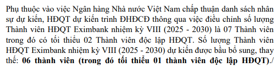 Phụ thuộc vào việc chấp thuận của Ngân hàng Nhà nước đối với danh sách nhân sự dự kiến, HĐQT Eximbank sẽ trình ĐHĐCĐ phương án điều chỉnh số lượng thành viên HĐQT nhiệm kỳ VIII lên 7 thành viên, trong đó có tối thiểu 2 thành viên độc lập.