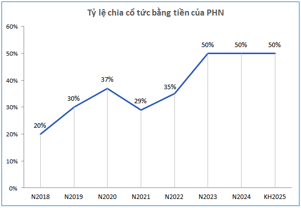 Dù hạ mục tiêu lợi nhuận, PHN không đề cập đến việc điều chỉnh kế hoạch cổ tức năm 2025. Theo nghị quyết ĐHĐCĐ thường niên 2025, Doanh nghiệp vẫn duy trì chính sách cổ tức tiền mặt ổn định ở mức 50% trong 3 năm liên tiếp kể từ 2023. Như vậy, sau 2 đợt tạm ứng với tổng tỷ lệ 40%, cổ đông PHN dự kiến còn nhận thêm cổ tức 10% để hoàn tất kế hoạch 2025.