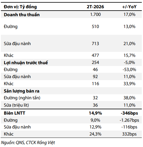 Theo báo cáo cập nhật của Chứng khoán Rồng Việt (VDSC), CTCP Đường Quảng Ngãi (UPCoM: QNS) ghi nhận doanh thu thuần 1,700 tỷ đồng trong 2 tháng đầu năm 2026, tăng 17% so với cùng kỳ năm trước. Tuy nhiên, lợi nhuận trước thuế giảm 5% xuống còn 254 tỷ đồng.