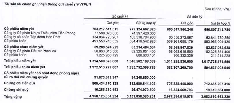 Với nguồn lực được bổ sung, Công ty đầu tư mạnh vào tự doanh, nâng giá trị hợp lý tài sản tài chính ghi nhận thông qua lãi/lỗ (FVTPL) từ gần 3.1 ngàn tỷ đồng lên hơn 5.1 ngàn tỷ đồng; đồng thời bổ sung vốn cho vay, đẩy dư nợ từ hơn 5.2 ngàn tỷ đồng lên hơn 8.3 ngàn tỷ đồng.