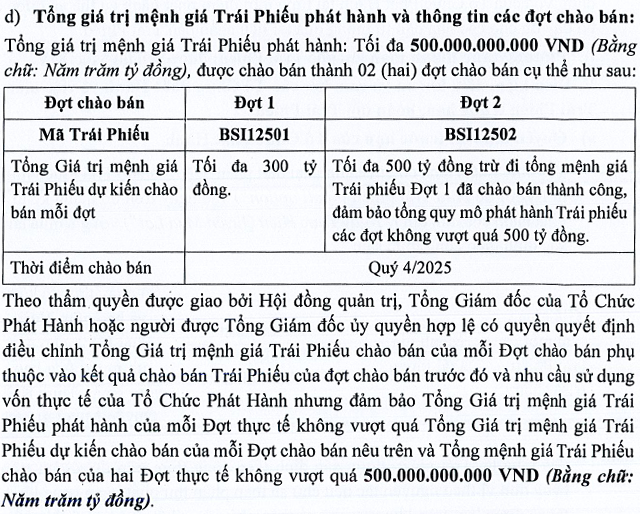 Cụ thể, BSI dự kiến phát hành tối đa 5,000 trái phiếu riêng lẻ theo mệnh giá 100 triệu đồng/trái phiếu, tương ứng tổng giá trị tối đa 500 tỷ đồng. Công ty sẽ không phát hành một lần mà chia làm hai đợt, với đợt 1 (BSI12501) tối đa 300 tỷ đồng và đợt 2 (BSI12502) tối đa 500 tỷ đồng trừ đi tổng mệnh giá đợt 1 đã chào bán thành công, đảm bảo quy mô phát hành không vượt ngưỡng đã đề ra.