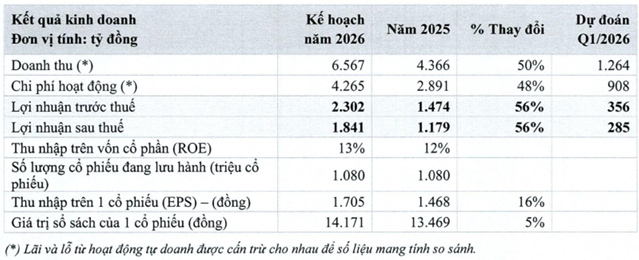 Trước bối cảnh đó, Công ty đặt mục tiêu mang về 6,576 tỷ đồng doanh thu và 2,302 tỷ đồng lãi trước thuế, lần lượt tăng 50% và 56% so với thực hiện năm 2025. Đối với các chỉ tiêu hiệu quả, ROE dự kiến đạt 13% với kỳ vọng tăng trưởng lợi nhuận từ các mảng kinh doanh và vốn mới tăng vào cuối năm 2025, đồng thời EPS đạt 1,705 đồng/cp, tăng 16%.