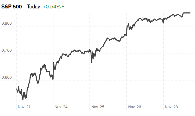 Chỉ số S&P 500 đã tăng 0.5% trong phiên giao ngày 28/11 vì lễ Tạ ơn, đánh dấu cột mốc quan trọng khi chỉ số này quay trở lại gần mức kỷ lục. Điều đáng chú ý là tình hình đã thay đổi hoàn toàn so với đầu tháng, khi S&P 500 từng giảm hơn 5% và chạm đáy vào ngày 20/11 giữa làn sóng bán tháo cổ phiếu AI.