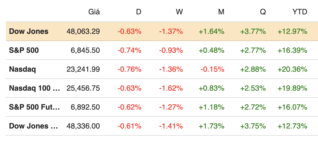 Khép phiên ngày 31/12, chỉ số S&P 500 giảm 0.74%, đóng cửa ở 6,845.50 điểm. Nasdaq Composite mất 0.76%, kết phiên tại 23,241.99 điểm. Chỉ số Dow Jones Industrial Average giảm 303.77 điểm, tương đương 0.63%, xuống 48,063.29 điểm.