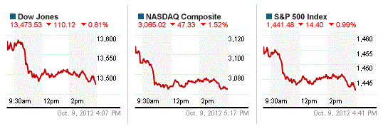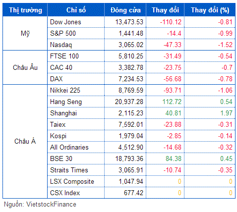 Kết thúc ngày giao dịch, chỉ số Dow Jones giảm 110.12 điểm (0.81%) xuống 13,473.53 điểm, chỉ số S&P 500 mất 14.40 điểm (0.99%) xuống 1,441.48 điểm, chỉ số Nasdaq Composite rớt 47.33 điểm (1.52%) xuống 3,065.02 điểm.