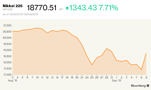 Chỉ số Topix cũng tăng vọt 6.4% lên 1,507.37 điểm, mức tăng mạnh nhất kể từ tháng 3/2011 với khối lượng cao hơn 9% so với mức bình quân 30 ngày. Tính đến ngày thứ Ba, chỉ số Topix đã giảm khoảng 16% so với mức đỉnh của tháng 8 do mối lo ngại về triển vọng kinh tế Trung Quốc.
