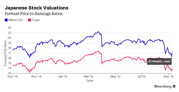 Số liệu của Bloomberg cho thấy tại thời điểm đóng cửa phiên giao dịch ngày thứ Ba, Nikkei 225 giao dịch với P/E 16.4 lần, mức thấp nhất kể từ tháng 10/2014. Hệ số P/E của Topix là 13.5 lần, cũng là mức thấp nhất kể từ tháng 10 năm ngoái.