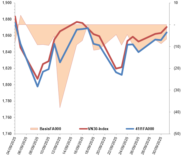Các hợp đồng tương lai đồng loạt tăng điểm trong phiên giao dịch ngày 01/10/2025. Cụ thể, 41I1FA000 (FA000) tăng 0.52%, đạt 1,864 điểm; 41I1FB000 (FB000) tăng 0.45%, đạt 1,862 điểm; hợp đồng VN30F2512 (F2512) tăng 0.58%, đạt 1,858 điểm; hợp đồng 41I1G3000 (G3000) tăng 0.44%, đạt 1,838 điểm. Chỉ số cơ sở VN30-Index kết phiên ở mức 1,870.63 điểm.