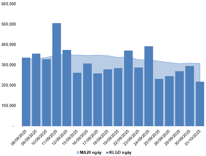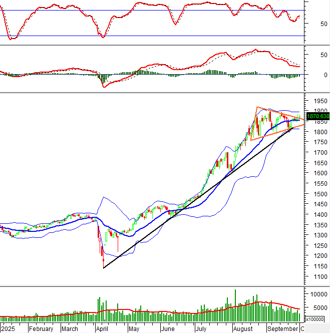 Trong phiên giao dịch ngày 01/10/2025, VN30-Index tăng điểm phiên thứ 3 liên tiếp và tiếp tục vận động trên đường Middle của Bollinger Bands cho thấy tâm lý khá lạc quan của nhà đầu tư vẫn hiện hữu.