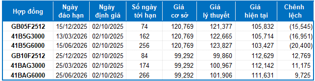 Dựa trên phương pháp định giá hợp lý với thời điểm khởi đầu ngày 02/10/2025, khung giá hợp lý của các hợp đồng tương lai đang được giao dịch trên thị trường được thể hiện như sau: