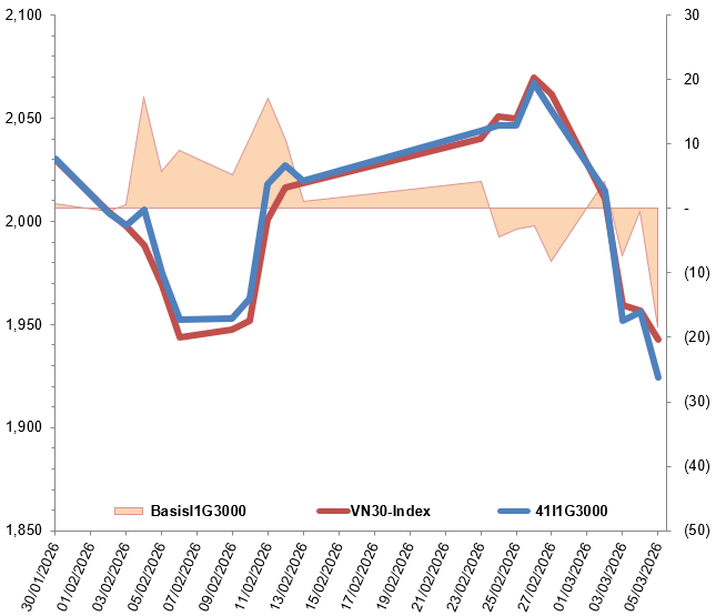 Các hợp đồng tương lai VN30 đồng loạt giảm điểm trong phiên giao dịch ngày 05/03/2026. Cụ thể, 41I1G3000 (I1G3000) giảm 1.62%, còn 1,924.4 điểm; 41I1G4000 (I1G4000) giảm 1.6%, còn 1,922 điểm; hợp đồng 41I1G6000 (I1G6000) giảm 0.14%, còn 1,937.7 điểm; hợp đồng 41I1G9000 (I1G9000) giảm 1.13%, còn 1,930 điểm. Chỉ số cơ sở VN30-Index kết phiên ở mức 1,942.76 điểm.