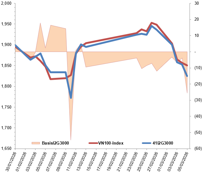 Ngoài ra, các hợp đồng tương lai VN100 đồng loạt giảm điểm trong phiên giao dịch ngày 05/03/2026. Cụ thể, 41I2G3000 (I2G3000) giảm 1.5%, còn 1,825 điểm; 41I2G4000 (I2G4000) giảm 0.1%, còn 1,837.2 điểm; hợp đồng 41I2G6000 (I2G6000) giảm 1.39%, còn 1,837.9 điểm; hợp đồng 41I2G9000 (I2G9000) giảm 0.99%, còn 1,829.8 điểm. Chỉ số cơ sở VN100-Index kết phiên ở mức 1,850.66 điểm.