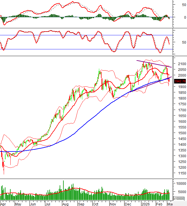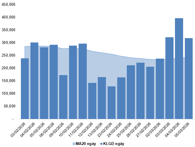Trong phiên giao dịch ngày 05/03/2026, VN30-Index giảm điểm sau khi kiểm tra lại đường SMA 100 ngày kèm theo khối lượng giao dịch vượt mức trung bình 20 phiên cho thấy tâm lý khá bi quan của nhà đầu tư.