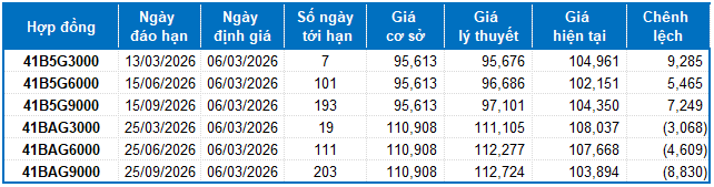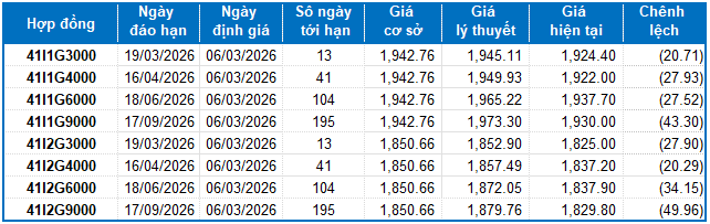 Dựa trên phương pháp định giá hợp lý với thời điểm khởi đầu ngày 06/03/2026, khung giá hợp lý của các hợp đồng tương lai đang được giao dịch trên thị trường được thể hiện như sau: