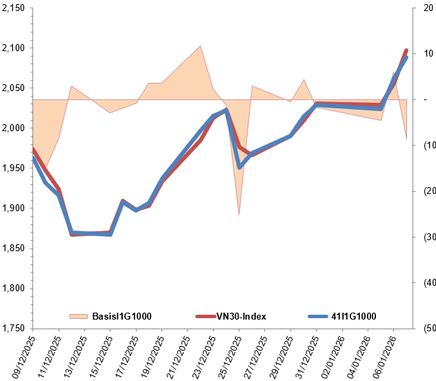 Các hợp đồng tương lai VN30 đồng loạt tăng điểm trong phiên giao dịch ngày 07/01/2026. Cụ thể, 41I1G1000 (I1G1000) tăng 1.27%, đạt 2,088.2 điểm; 41I1G2000 (I1G2000) tăng 1.5%, đạt 2,088.9 điểm; hợp đồng 41I1G3000 (I1G3000) tăng 1.83%, đạt 2,088.9 điểm; hợp đồng 41I1G6000 (I1G6000) tăng 1.57%, đạt 2,082.2 điểm. Chỉ số cơ sở VN30-Index kết phiên ở mức 2,096.76 điểm.