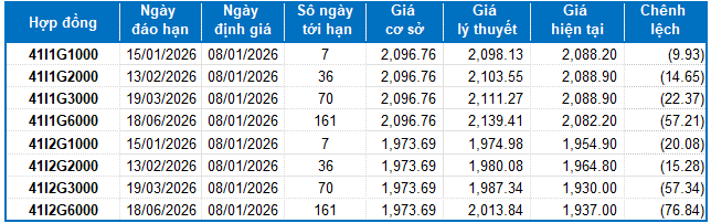 Dựa trên phương pháp định giá hợp lý với thời điểm khởi đầu ngày 08/01/2026, khung giá hợp lý của các hợp đồng tương lai đang được giao dịch trên thị trường được thể hiện như sau: