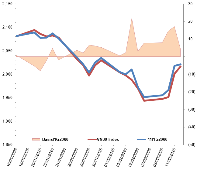 Trong phiên giao dịch ngày 12/02/2026, hợp đồng 41I1G2000 từ bật tăng đầu phiên chuyển sang trạng thái giằng co kéo dài quanh mốc tham chiếu trong suốt phiên sáng. Bước sang phiên chiều, phe Long dần có phần lấn lướt hơn giúp cho I1G2000 bật tăng nhưng áp lực bán xuất hiện trở lại vào cuối phiên khiến đà tăng của hợp đồng tương lai này bị thu hẹp và đóng cửa tại mốc 2,021 điểm.