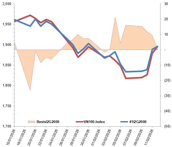 Ngoài ra, các hợp đồng tương lai VN100 đồng loạt tăng điểm trong phiên giao dịch ngày 12/02/2026. Cụ thể, 41I2G2000 (I2G2000) tăng 0.38%, đạt 1,896 điểm; 41I2G3000 (I2G3000) tăng 1.25%, đạt 1,900.7 điểm; hợp đồng 41I2G6000 (I2G6000) tăng 1.34%, đạt 1,889 điểm; hợp đồng 41I2G9000 (I2G9000) tăng 0.81%, đạt 1,890.2 điểm. Chỉ số cơ sở VN100-Index kết phiên ở mức 1,895.81 điểm.