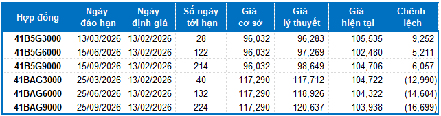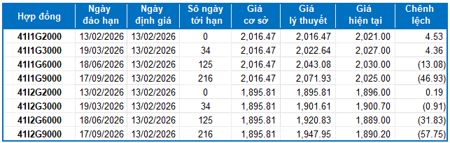 Dựa trên phương pháp định giá hợp lý với thời điểm khởi đầu ngày 13/02/2026, khung giá hợp lý của các hợp đồng tương lai đang được giao dịch trên thị trường được thể hiện như sau: