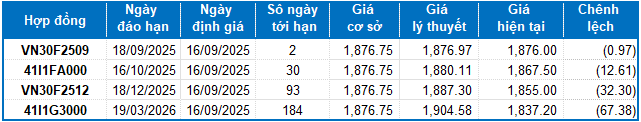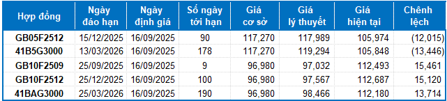 Dựa trên phương pháp định giá hợp lý với thời điểm khởi đầu ngày 16/09/2025, khung giá hợp lý của các hợp đồng tương lai đang được giao dịch trên thị trường được thể hiện như sau:
