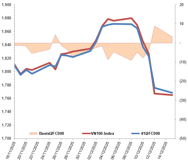 Ngoài ra, các hợp đồng tương lai VN100 đồng loạt giảm điểm trong phiên giao dịch ngày 15/12/2025. Cụ thể, 41I2FC000 (I2FC000) giảm 0.43%, còn 1,768.4 điểm; 41I2G1000 (I2G1000) giảm 0.12%, còn 1,777.8 điểm; hợp đồng 41I2G3000 (I2G3000) giảm 0.69%, còn 1,767.6 điểm; hợp đồng 41I2G6000 (I2G6000) giảm 0.58%, còn 1,752.3 điểm. Chỉ số cơ sở VN100-Index kết phiên ở mức 1,765.08 điểm.