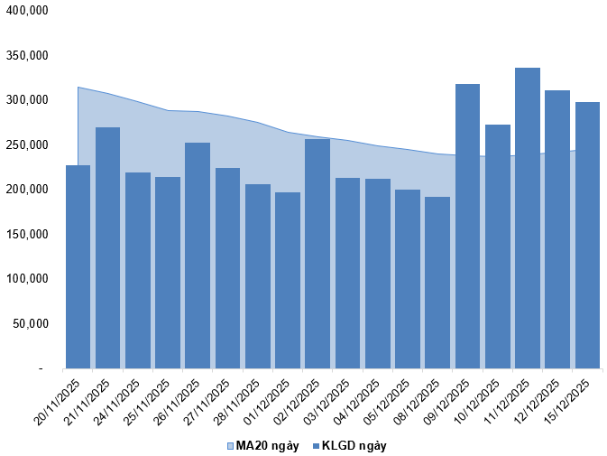 Trong phiên giao dịch ngày 15/12/2025, VN30-Index diễn biến giằng co đồng thời xuất hiện mẫu hình nến gần giống Doji kèm theo khối lượng giao dịch sụt giảm và nằm dưới mức trung bình 20 phiên cho thấy tâm lý phân vân của nhà đầu tư.