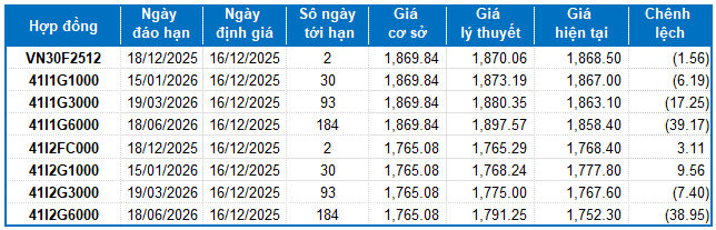 Các hợp đồng tương lai VN30 đồng loạt giảm điểm trong phiên giao dịch ngày 15/12/2025. Cụ thể, VN30F2512 (F2512) giảm 0.13%, còn 1,868.5 điểm; 41I1G1000 (I1G1000) giảm 0.16%, còn 1,867 điểm; hợp đồng 41I1G3000 (I1G3000) giảm 0.47%, còn 1,863.1 điểm; hợp đồng 41I1G6000 (I1G6000) giảm 0.62%, còn 1,858.4 điểm. Chỉ số cơ sở VN30-Index kết phiên ở mức 1,869.84 điểm.