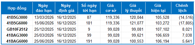 Dựa trên phương pháp định giá hợp lý với thời điểm khởi đầu ngày 16/12/2025, khung giá hợp lý của các hợp đồng tương lai đang được giao dịch trên thị trường được thể hiện như sau: