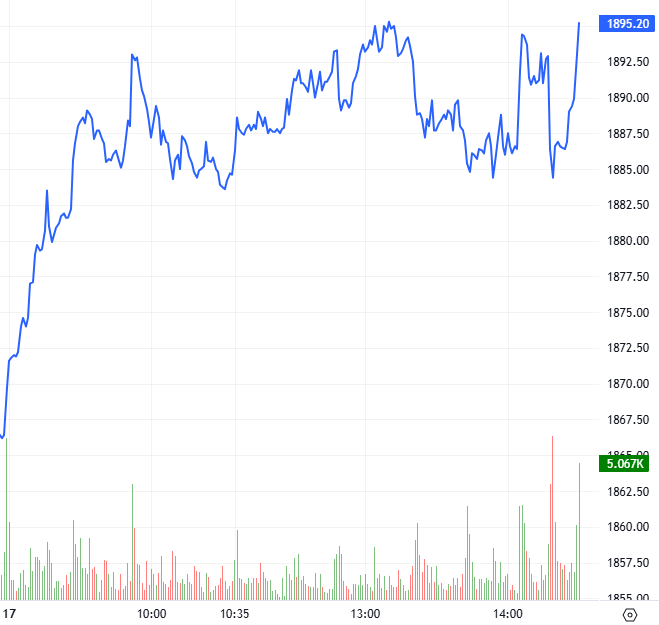 Trong phiên giao dịch ngày 17/11/2025, hợp đồng 41I1FB000 bật tăng mạnh từ khi mở cửa và phe Long duy trì vị thế lấn lướt trong suốt phiên sáng giúp I1FB000 giữ vững đà tăng. Sang đến phiên chiều, hợp đồng rơi vào trạng thái giằng co quyết liệt nhưng bên mua tiếp tục chiếm ưu thế đến cuối phiên. Qua đó, I1FB000 đóng cửa tại mức 1,895.2 điểm, tăng 25.5 điểm so với phiên cuối tuần trước.