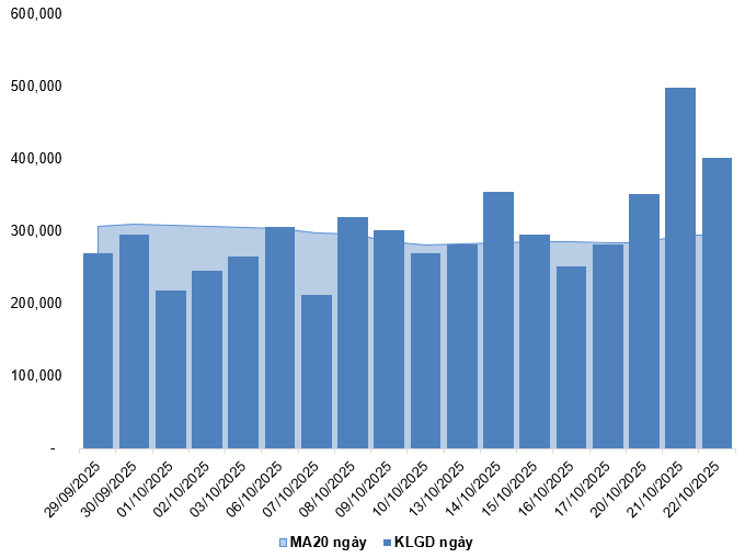 Trong phiên giao dịch ngày 22/10/2025, VN30-Index tiếp tục tăng điểm sau khi kiểm tra lại đường SMA 50 ngày đồng thời xuất hiện mẫu hình nến Dragonfly Doji.