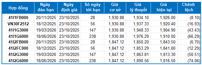 Dựa trên phương pháp định giá hợp lý với thời điểm khởi đầu ngày 23/10/2025, khung giá hợp lý của các hợp đồng tương lai đang được giao dịch trên thị trường được thể hiện như sau: