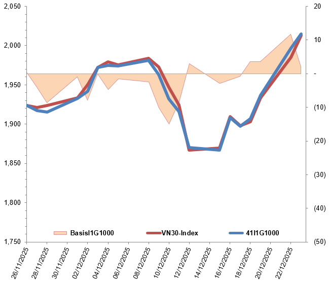 Trong phiên giao dịch ngày 23/12/2025, hợp đồng 41I1G1000 sớm bật tăng ngay từ phiên ATO và áp lực bán xuất hiện khiến đà tăng của I1G1000 bị thu hẹp nhưng bên mua dần lấy lại vị thế giúp hợp đồng này tăng nhẹ trở lại. Bước sang phiên chiều, hợp đồng này rơi vào thế giằng co nhưng phe Long vẫn nắm quyền kiểm soát. Kết phiên, hợp đồng này đóng cửa tại mức 2,015 điểm, tăng 18 điểm so với phiên trước.
