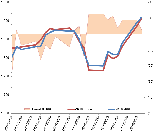 Ngoài ra, các hợp đồng tương lai VN100 đồng loạt tăng điểm trong phiên giao dịch ngày 23/12/2025. Cụ thể, 41I2G1000 (I2G1000) tăng 0.8%, đạt 1,909.9 điểm; 41I2G2000 (I2G2000) tăng 1.2%, đạt 1,907 điểm; hợp đồng 41I2G3000 (I2G3000) tăng 0.96%, đạt 1,902.4 điểm; hợp đồng 41I2G6000 (I2G6000) tăng 1.03%, đạt 1,896.8 điểm. Chỉ số cơ sở VN100-Index kết phiên ở mức 1,907.33 điểm.