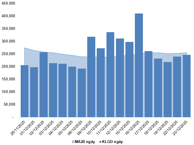 Trong phiên giao dịch ngày 23/12/2025, VN30-Index tăng điểm phiên thứ 4 liên tiếp kèm theo khối lượng giao dịch tiếp tục vượt mức trung bình 20 phiên cho thấy tâm lý khá lạc quan của nhà đầu tư.
