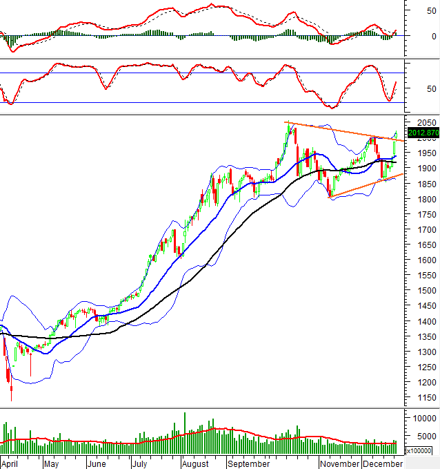 Hiện tại, chỉ số đang kiểm tra lại đỉnh cũ tháng 10/2025 (tương đương vùng 2,000-2,050 điểm) và bám dải trên (Upper Band) của Bollinger Bands.