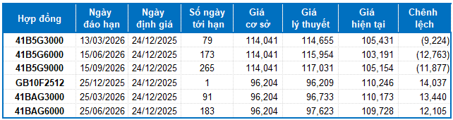 Dựa trên phương pháp định giá hợp lý với thời điểm khởi đầu ngày 24/12/2025, khung giá hợp lý của các hợp đồng tương lai đang được giao dịch trên thị trường được thể hiện như sau: