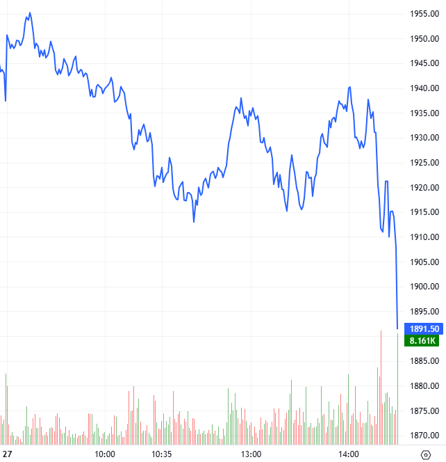 Trong phiên giao dịch ngày 27/10/2025, hợp đồng 41I1FB000 sớm bật tăng ngay từ phiên ATO nhưng bên mua dần đánh mất vị thế khi áp lực bán gia tăng trở lại khiến I1FB000 đảo chiều suy yếu. Bước sang phiên chiều, phe Long mặc dù đã hỗ trợ kéo hợp đồng này phục hồi lấy lại mốc tham chiếu nhưng bên bán vẫn có phần chiếm ưu thế hơn và một lần nữa dìm I1FB000 xuống mức thấp nhất phiên và đóng cửa tại 1,891.5 điểm, giảm 45.9 điểm.