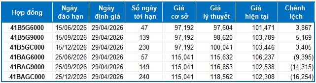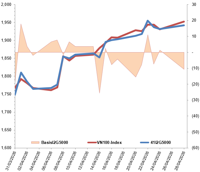 Ngoài ra, các hợp đồng tương lai VN100 hầu hết đều tăng trong phiên giao dịch ngày 28/04/2026. Cụ thể, 41I2G5000 (I2G5000) tăng 0.52%, đạt 1,942.1 điểm; 41I2G6000 (I2G6000) tăng 2.14%, đạt 1,948 điểm; hợp đồng 41I2G9000 (I2G9000) tăng 1.33%, đạt 1,943.5 điểm; hợp đồng 41I2GC000 (I2GC000) dừng ngay mốc tham chiếu, đạt 1,920 điểm. Chỉ số cơ sở VN100-Index kết phiên ở mức 1,952.67 điểm.