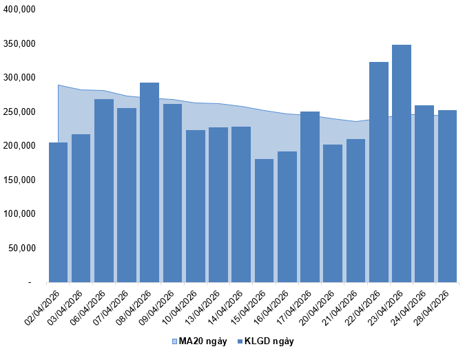 Trong phiên giao dịch ngày 28/04/2026, VN30-Index liên tục xuất hiện các phiên tăng giảm đan xen kèm theo khối lượng giao dịch trồi sụt thất thường cho thấy tâm lý thiếu ổn định của nhà đầu tư.