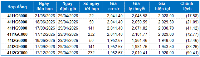 Các hợp đồng tương lai VN30 đồng loạt tăng điểm trong phiên giao dịch ngày 28/04/2026. Cụ thể, 41I1G5000 (I1G5000) tăng 0.65%, đạt 2,028 điểm; 41I1G6000 (I1G6000) tăng 0.74%, đạt 2,029.5 điểm; hợp đồng 41I1G9000 (I1G9000) tăng 0.83%, đạt 2,030.7 điểm; hợp đồng 41I1GC000 (I1GC000) tăng 1%, đạt 2,029 điểm. Chỉ số cơ sở VN30-Index kết phiên ở mức 2,041.4 điểm.