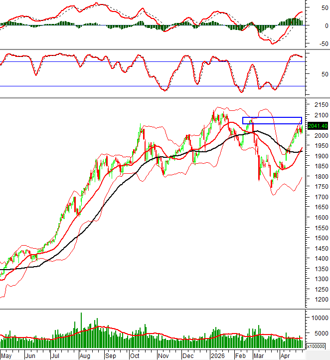 Hiện tại, chỉ số tiếp tục bám dải trên của Bollinger Bands và đang tiến về gần đỉnh cũ tháng 2/2026 (tương đương vùng 2,050-2,085 điểm).