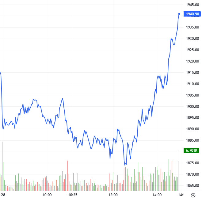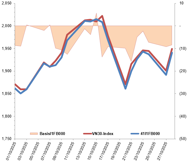 Trong phiên giao dịch ngày 28/10/2025, hợp đồng 41I1FB000 biến động giằng co quanh mốc tham chiếu với lợi thế nghiêng về phe Long trong nửa đầu phiên nhưng áp lực bán dần gia tăng khiến I1FB000 đảo chiều giảm nhẹ trong thời gian còn lại của phiên sáng. Bước sang phiên chiều, bên mua dần lấy lại vị thế giúp cho hợp đồng này hồi phục và tăng vọt mạnh mẽ đến cuối phiên. Qua đó, 41I1FB000 đóng cửa tại mốc 1,940.9 điểm, tăng 49.4 điểm.
