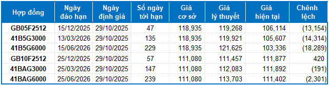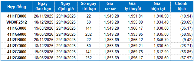 Dựa trên phương pháp định giá hợp lý với thời điểm khởi đầu ngày 29/10/2025, khung giá hợp lý của các hợp đồng tương lai đang được giao dịch trên thị trường được thể hiện như sau:
