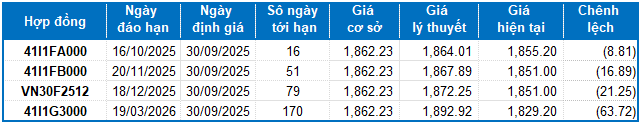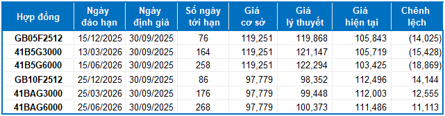 Dựa trên phương pháp định giá hợp lý với thời điểm khởi đầu ngày 30/09/2025, khung giá hợp lý của các hợp đồng tương lai đang được giao dịch trên thị trường được thể hiện như sau: