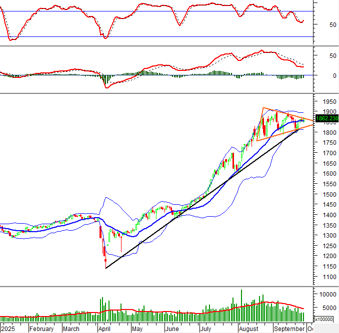 Trong phiên giao dịch ngày 29/09/2025, VN30-Index tăng điểm nhẹ và tiếp tục nằm trên đường Middle của Bollinger Bands kèm theo khối lượng có sự gia tăng so với phiên trước đó cho thấy tâm lý khá lạc quan của nhà đầu tư.