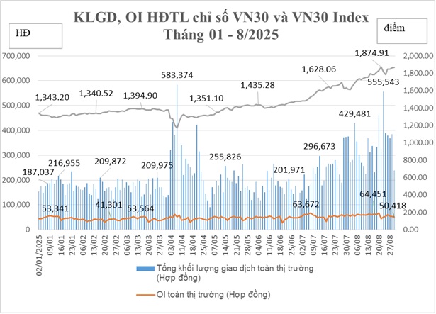 Chứng khoán phái sinh tháng 8/2025: Khối lượng hợp đồng mở đạt mức cao nhất từ đầu năm