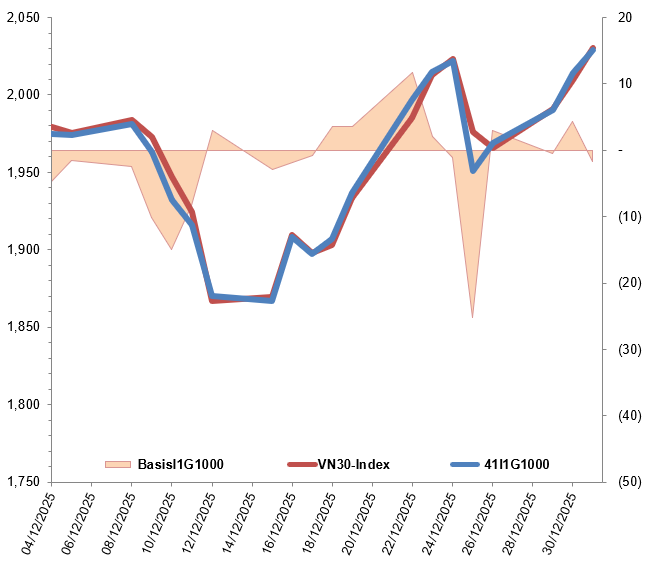 Các hợp đồng tương lai VN30 đồng loạt tăng điểm trong phiên giao dịch ngày 31/12/2025. Cụ thể, 41I1G1000 (I1G1000) tăng 0.74%, đạt 2,029 điểm; 41I1G2000 (I1G2000) tăng 0.85%, đạt 2,028 điểm; hợp đồng 41I1G3000 (I1G3000) tăng 1.22%, đạt 2,024.1 điểm; hợp đồng 41I1G6000 (I1G6000) tăng 1.45%, đạt 2,020 điểm. Chỉ số cơ sở VN30-Index kết phiên ở mức 2,030.63 điểm.
